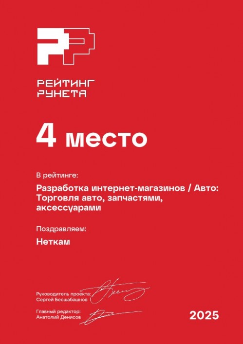4 место в рейтинге веб-студий России, занимающихся разработкой интернет-магазинов, сфера «Авто и запчасти». Премия Рейтинг Рунета — 2025.