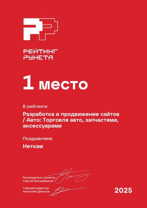 1 место в рейтинге веб-студий России, занимающихся разработкой и продвижением сайтов, сфера «Авто и запасные части». Премия Рейтинг Рунета — 2025.