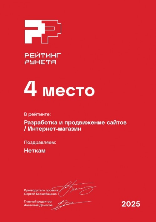 4 место в рейтинге веб-студий России, занимающихся разработкой и продвижением интернет-магазинов. Премия Рейтинг Рунета — 2025.