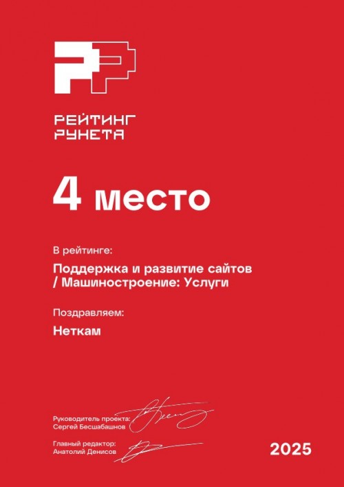 4 место в рейтинге веб-студий России, занимающихся поддержкой и развитием сайтов в сфере «Машиностроение». Премия Рейтинг Рунета — 2025.