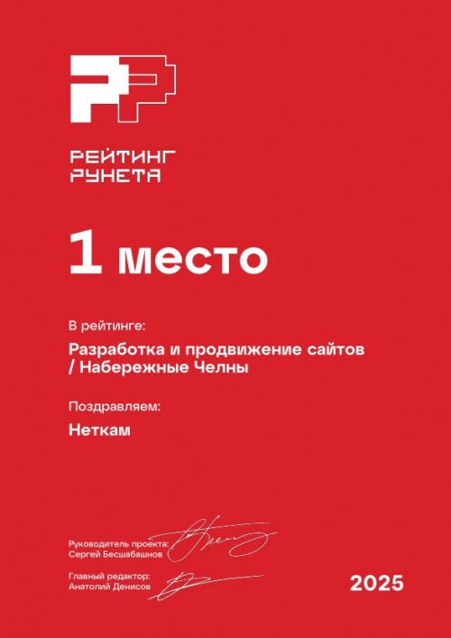 1 место в рейтинге веб-студий Набережных Челнов, занимающихся разработкой и продвижением сайтов. Премия Рейтинг Рунета — 2025.