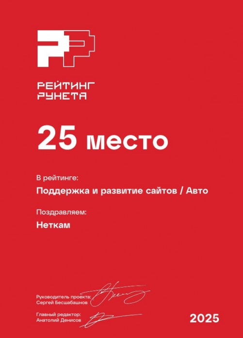 25 место в рейтинге веб-студий России, занимающихся поддержкой и развитием сайтов, сфера «Авто». Премия Рейтинг Рунета — 2025.