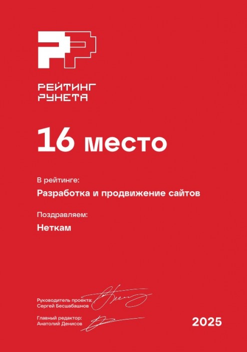 16 место в рейтинге веб-студий России, занимающихся разработкой и продвижением сайтов. Премия Рейтинг Рунета — 2025.