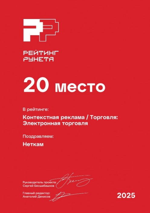 20 место в рейтинге агентств контекстной рекламы для интернет-магазинов в России. Премия Рейтинг Рунета — 2025.