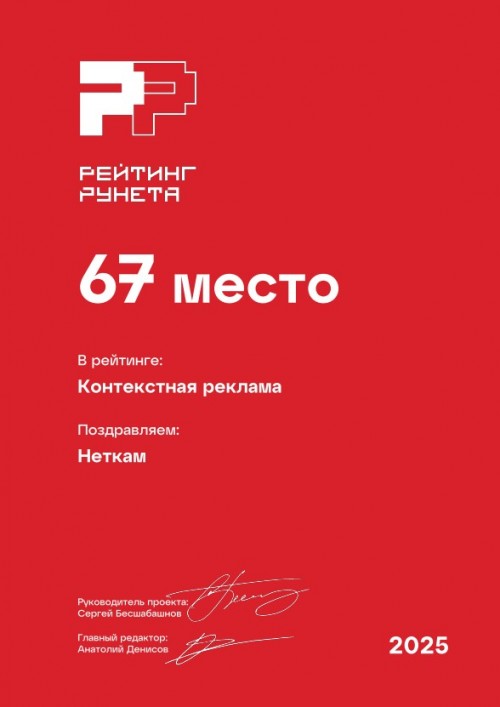 67 место в рейтинге агентств контекстной рекламы в России. Премия Рейтинг Рунета — 2025.