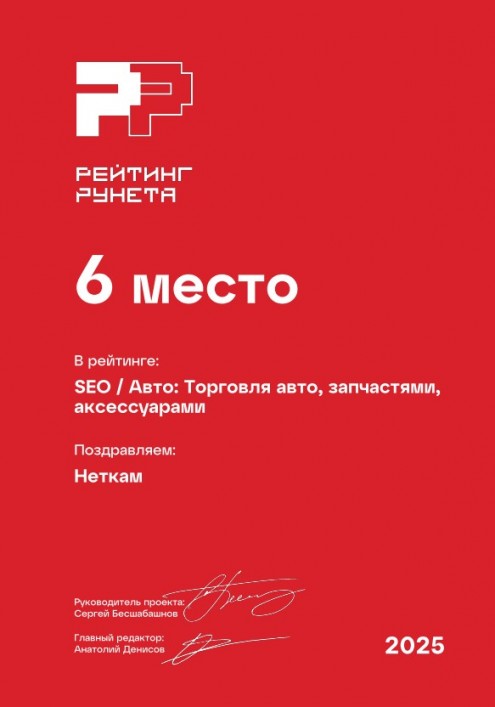 6 место в рейтинге SEO-компаний, сфера «Запасные части». Премия Рейтинг Рунета — 2025.
