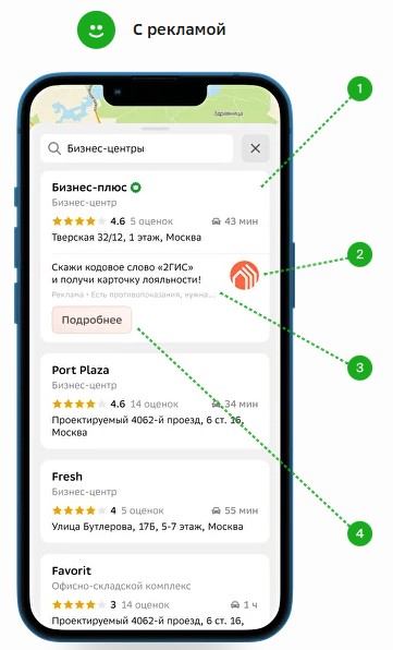 Пользователи видят такую рекламу в результатах поиска по рубрикам и организациям. Она учитывает их интерес к определённым товарам и услугам в конкретном месте: 1. Поднятие в списке